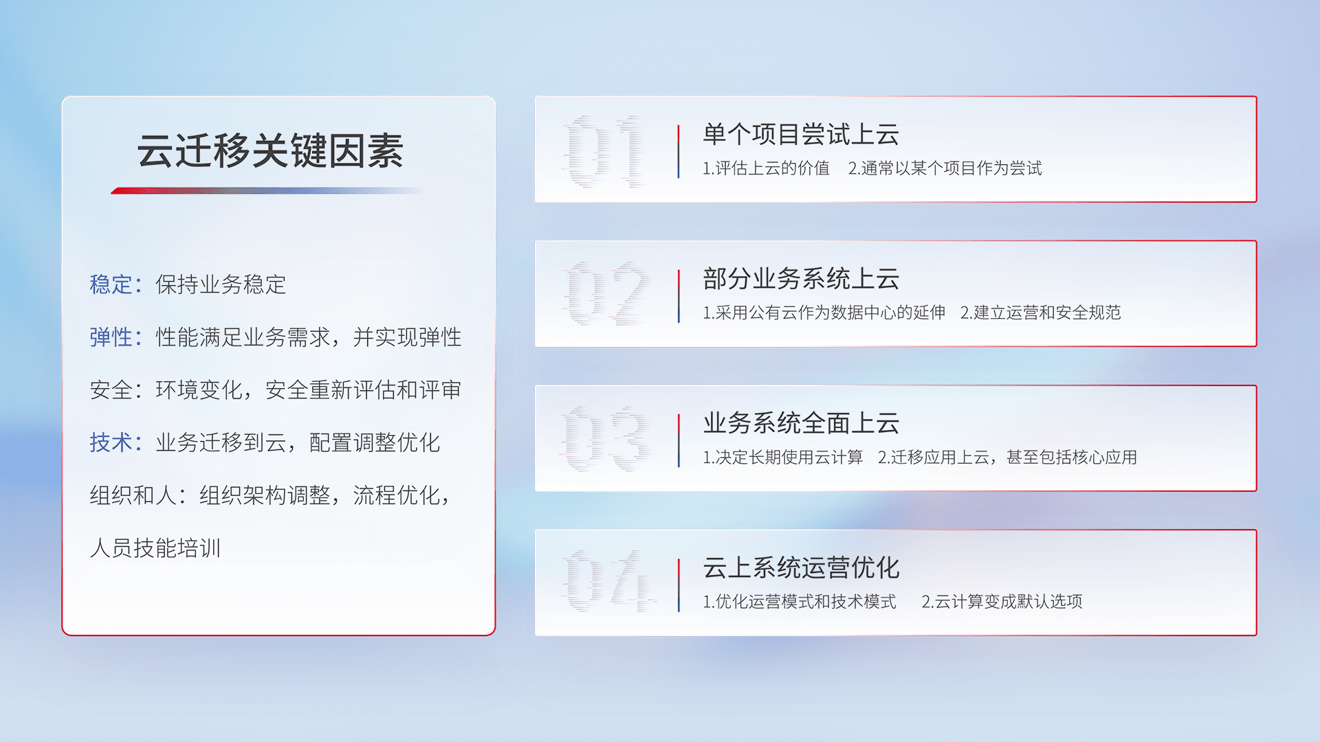 结合实际业务,,从规划设计、、云平台选型、、、云原生改造、、数据迁移、、集成交付,,迁移全过程为客户识别最佳上云路径,,做好风险识别管理,,设计网络架构、、身份权限、、安全审计合规、、操作审计、、日志审计、、监控告警策略、、、多站点容灾设计等,,,对云上基础设施进行整体规划,,,,提升IT治理水平,,以满足弹性、、、、高可用、、、、高性能的需求。。。