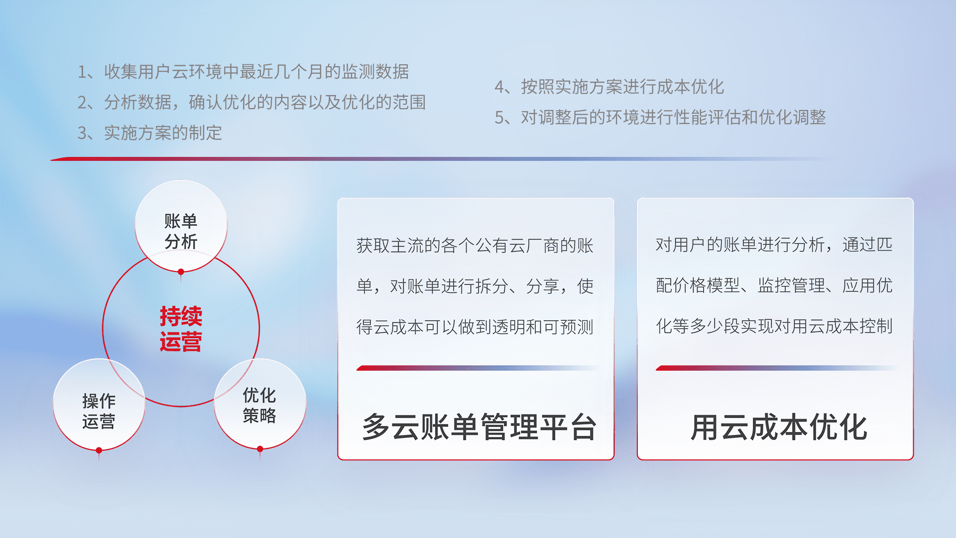 通过多云纳管,,,,以统一的资源数据模型把客户的云资源进行抽象和封装,,进而实现对多云资源的统一操作,,保障云资源管理的可靠性、、、、稳定性与可用性。。量身定制化运维内容,,,配置、、、、开发运维、、、补丁管理、、、、备份、、、监控、、、、认证和访问管理、、、、审计和日常巡检等,,,保障在用云过程中的可靠度,,稳定度以及高可用率。。