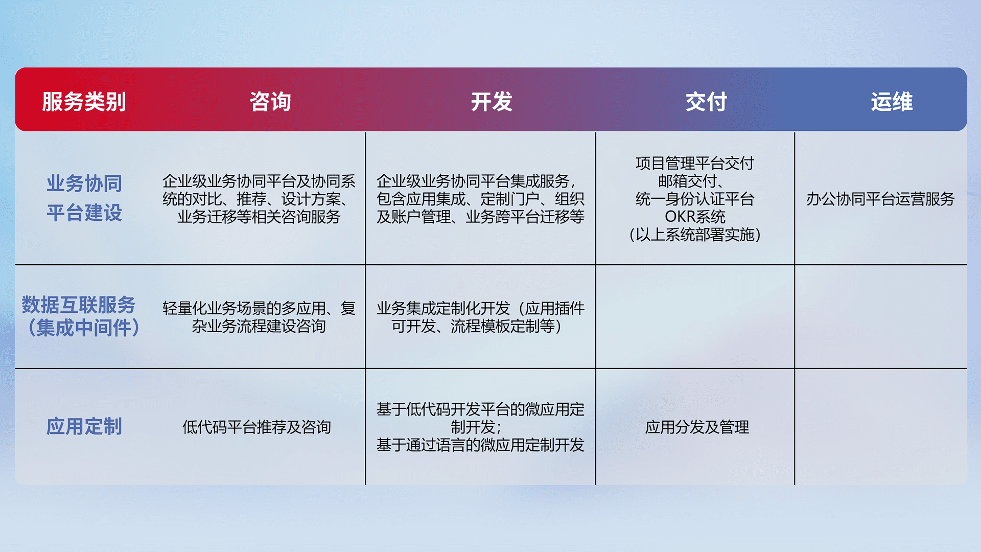 针对钉钉、、、、企微、、IDaas等平台级产品提供产品的规划、、、方案、、、、交付、、、、定制化开发等服务,,实现如统一协同办公、、、、智能客户服务、、、混合会议管理、、智能数据查询、、、等业务场景,,,实现数字化转型。。。